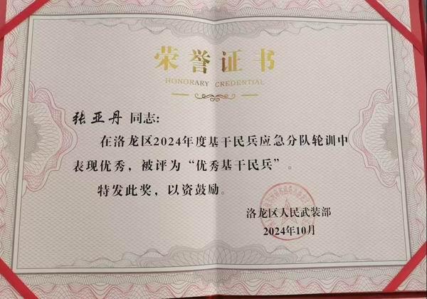 在洛龍區(qū)2024年基干民兵輪訓(xùn)備勤總結(jié)大會(huì)上,集團(tuán)支部黨員岳瑾哲、張亞丹在眾多基干民兵脫穎而出,被洛龍區(qū)人民武裝部授予“優(yōu)秀基干民兵”稱號(hào)。