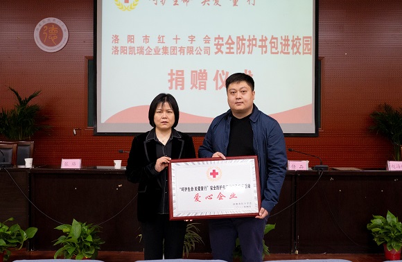 接著舉行了“簡約而不簡單”捐贈儀式,市紅十字會常務副會長王少俠先生、洛龍區(qū)人大副主任韓麗莉女士、洛陽凱瑞企業(yè)集團代表任品先生為洛龍區(qū)第一實驗小學、河南師范大學附屬洛陽中學、洛龍區(qū)龍城雙語中學定向捐贈安全防護書包套裝2129套;兩位領導并分別向凱瑞企業(yè)代表頒發(fā)愛心助學錦旗和捐贈證書。