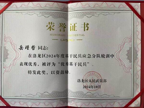在洛龍區(qū)2024年基干民兵輪訓(xùn)備勤總結(jié)大會(huì)上,集團(tuán)支部黨員岳瑾哲、張亞丹在眾多基干民兵脫穎而出,被洛龍區(qū)人民武裝部授予“優(yōu)秀基干民兵”稱號(hào)。